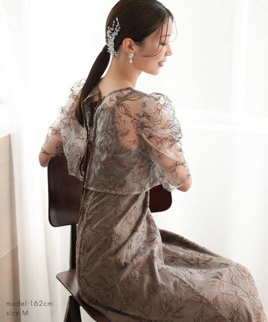 トップスは軽やかなシアー素材にフラワーモチーフの刺繍を施し、ケープのようなデザインに。