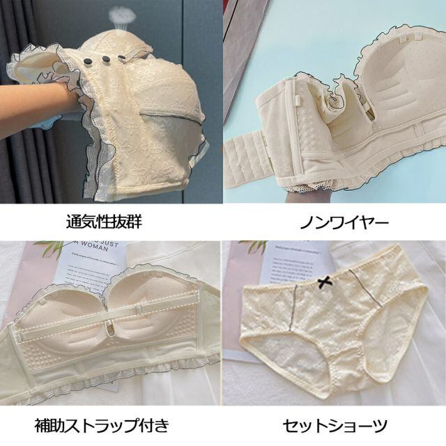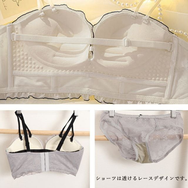 たっぷりレースが可愛らしい、盛れるブラ&ショーツの2点セット上部が薄め、下部を厚めにすることで上向きの美しいバストにストラップを外してチューブトップにもなる2way仕様