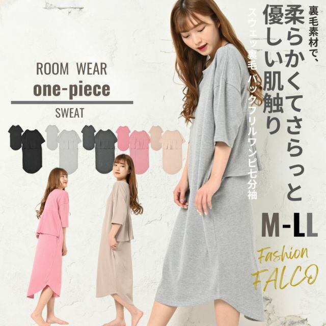 ルームウェアワンピーススウェット七分袖バックフリルワンピ七分袖レディースパジャマスエットヘムラウンドデザインワンマイルウェアゆったり可愛い部屋着秋冬